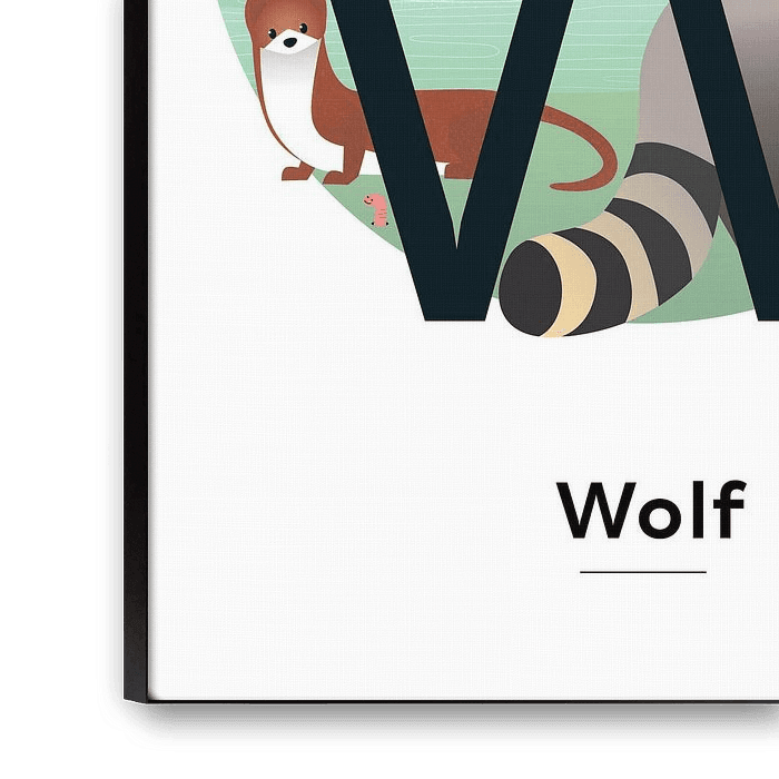 Anything with the W. A raccoon at a waterfall. A weasel, a worm and a wolf. Where does the cart go on the road? To the forest? And do you see the web and the clouds? Imagine it and make up your own story.