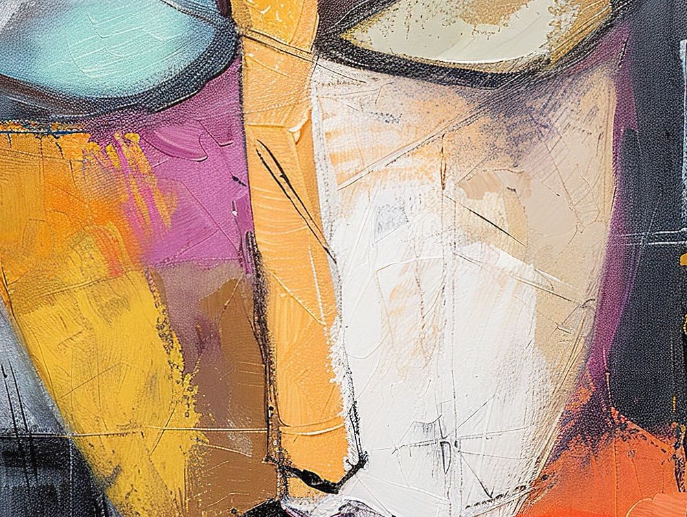 Details: abstract painting, woman painting, colourful portrait, modern art, yellow, orange, grey, blue, face, minimalist