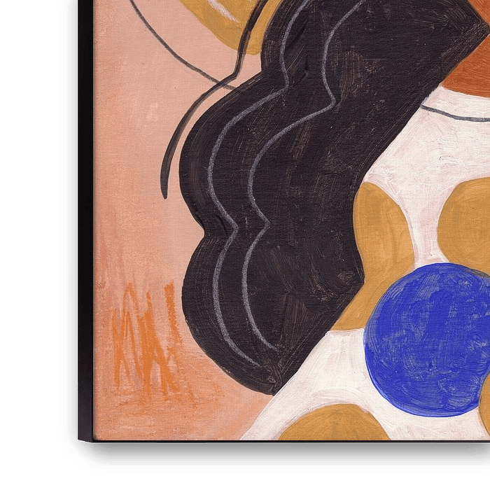 A portrait of a woman in thought, she has her eyes closed. She has black hair and is painted in earth tones with a pop of colour in cobalt blue. Round geometric shapes surround her. Original acrylic paint on paper.