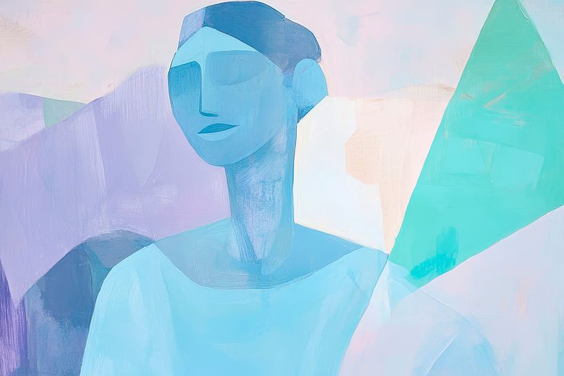 A soft hint of bluish colour envelops the still figure in a dream of geometric shapes. The harmonious colour tones create a calming atmosphere that is ideal for a bedroom. There, this work of art invites you to leave the stress of everyday life behind and immerse yourself in a world of calm and reflection.