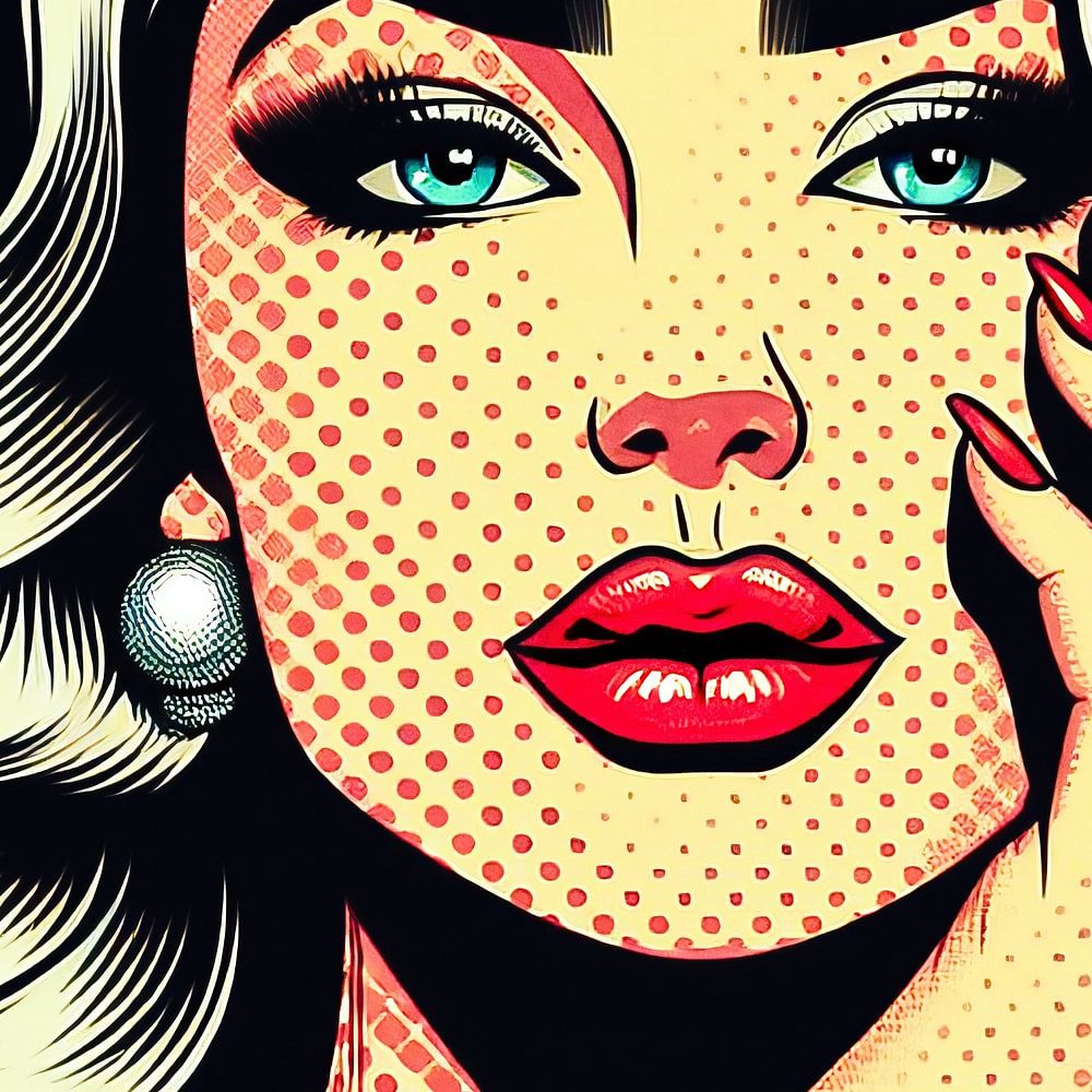 A portrait of a seductive looking woman in pop-art style. A sensual look with pale blue eyes and red lips.