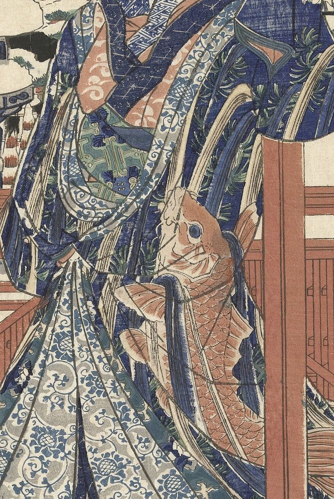 "Woman in kimono with a pattern of large carp, walking on a veranda in a snowy garden. Part of a multi-panel."