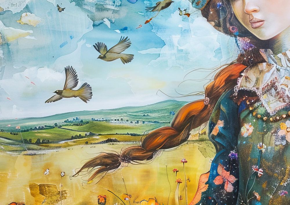 Details: woman, birds, flowers, meadow, farm, surreal, colourful, landscape, nature, portrait