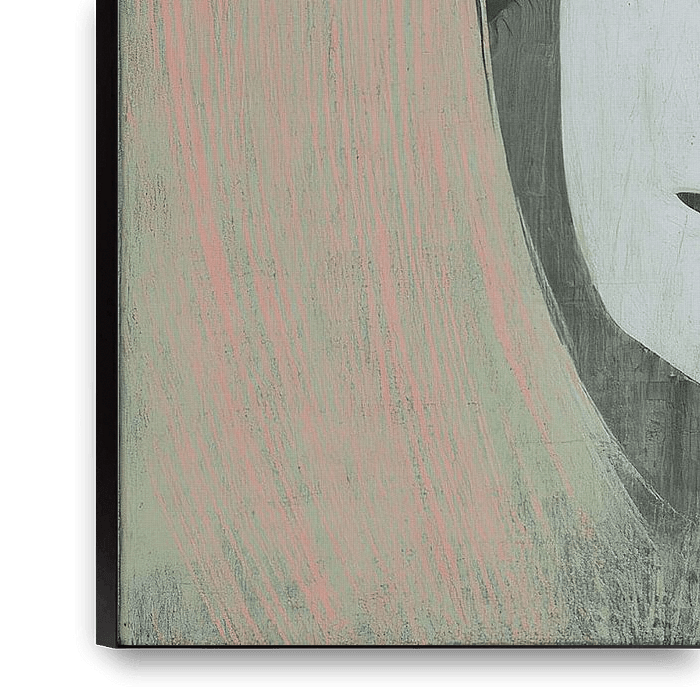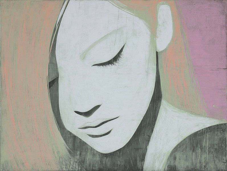 Het andere dominante element is het haar en de achtergrond: brede, zichtbare penseelstreken in zacht roze en perzikachtige tonen die het gezicht omlijsten. Die strepen zijn niet glad afgewerkt maar licht geribbeld; je ziet horizontale en lichte verticale krasjes in het oppervlak, alsof er met de rug van een penseel doorheen gehaald is. Deze warme achtergrondkleur contrasteert precies genoeg met het koele gelaat om spanning te geven zonder te schreeuwen. Het haar en de achtergrond werken als een zachte val: ze vangen het gezicht en duwen de blik terug naar die gesloten oogleden en de ingehouden mond.