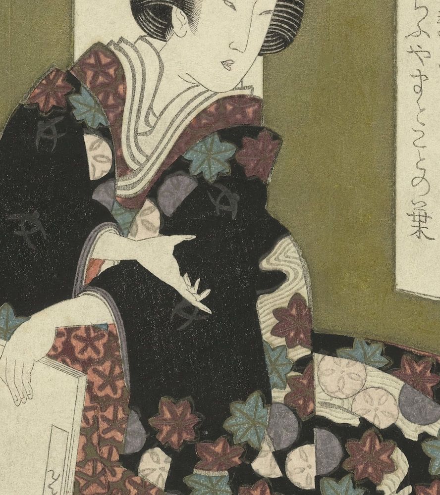"Lady kneeling by a pile of books, with the book The Flower of the East (Hana no en) in her hand. In the background a folding screen with two poems and a painting with bamboo. Leaf of a seven-panel."