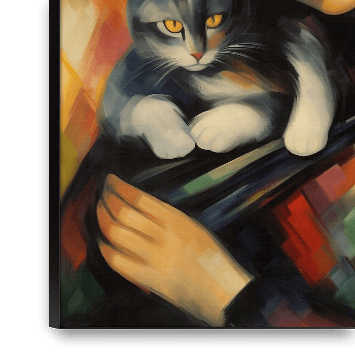 The classic painting shows a woman with her black and white kitten in her arms. The background is in bold, bright colours such as red, orange, green and blue, painted in a cubist and expressive style. The woman and kitten appear very relaxed. The dark, intense colours and the expressionist style of the painting, inspired by Franz Marc…