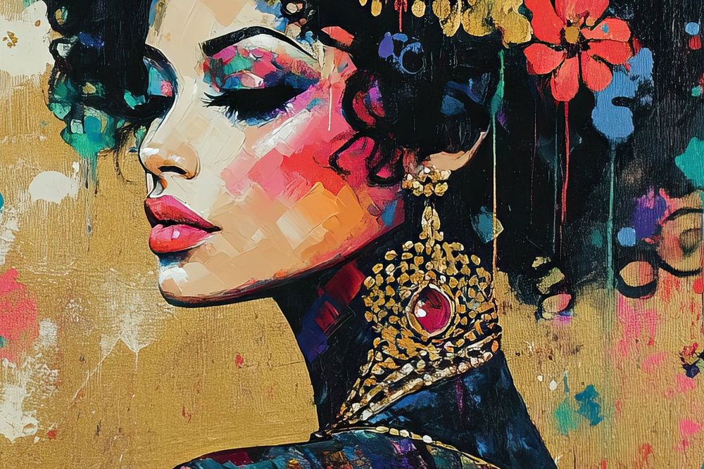 Woman with Flowers - This colourful woman portrait painting shows a woman with flowers in her hair and a vibrant look, surrounded by an abstract, multicoloured background that emphasises playfulness and melange of colours.
