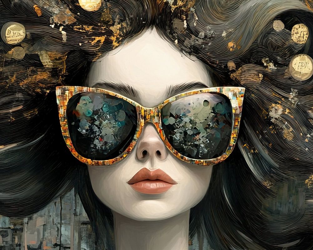 Woman with Gold Coins - This women's painting shows a woman wearing striking sunglasses, whose rich details in her wavy hair are surrounded by gold coins and an abstract background.