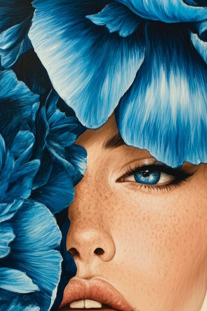 A fascinating fusion of man and nature unfolds before the viewer's eyes. Gigantic blue flowers frame the face of a woman with radiant eyes that enter into a deep dialogue with the beauty of nature. This work of art transforms any living room into an oasis of elegance and tranquillity.
