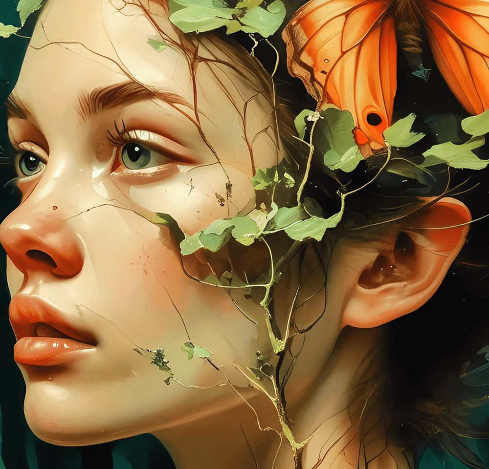 The painting shows a woman surrounded by an enchanting cloud of butterflies. Her face radiates a cheerful, almost dreamy expression, while her eyes look gently at the viewer. Her hair can be loose and wavy, moving as if the air around her is in tune with the butterflies dancing around her. The butterflies are detailed and have delicate wings in different colours, from soft pastel shades to bright orange, blue or yellow, creating a vivid contrast to her skin and clothing. The woman seems to be connected to nature and the butterflies can symbolise transformation, freedom or the transience of life. The background of the painting can be a tranquil garden, magical woods or an abstract sky, with the female figure and the butterflies taking centre stage in the artwork. The whole evokes a sense of peace, fragility and the beauty of nature.