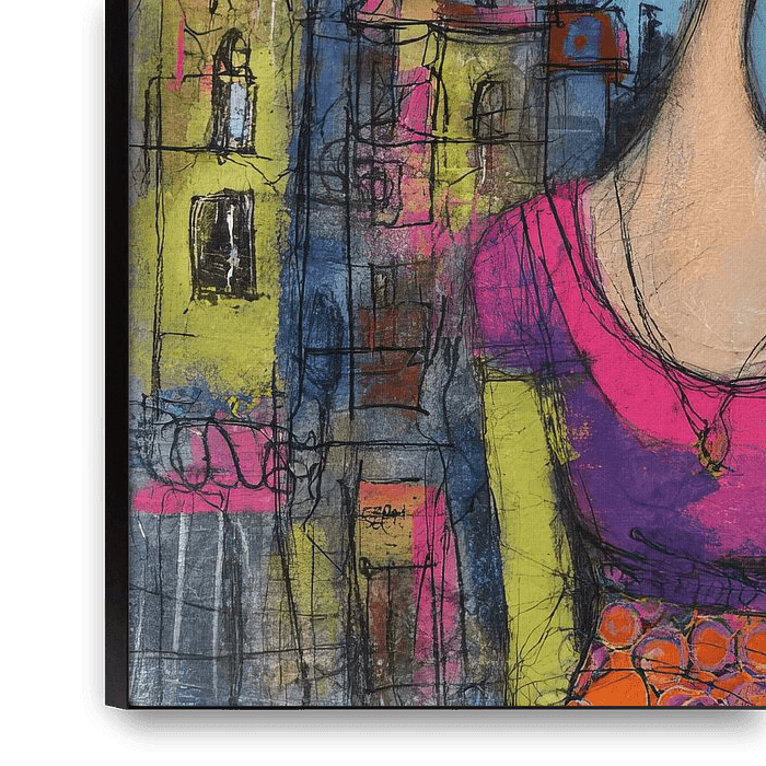 Woman with colourful clothes - This woman portrait painting shows a woman with a striking bunch of curly hair, dressed in a colourful blouse, while an abstract city can be seen in the background.