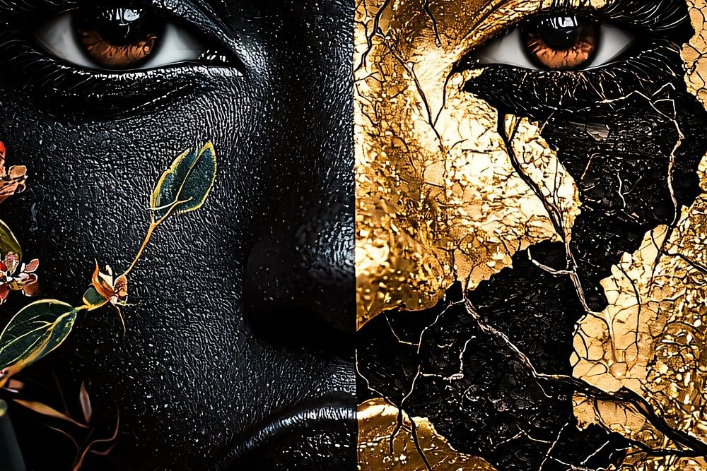 This artwork combines the dramatic contrast between dark and gold elements. The surreal portrait shows a woman whose face is interwoven with both flowers and fracture lines in gold. The flowers symbolise growth and nature, while the gold fractures convey a sense of sophistication and strength. The woman's eyes are intense and penetrating, challenging the viewer to look beyond the surface. This art is a mix of sophistication and raw nature, making it perfect for modern interiors that could use a touch of mystery and depth. The rich colours of black, gold and pink bring a warm yet powerful look that can bring any space to life.