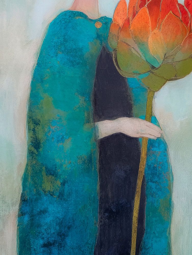 This painting shows a woman holding a beautiful, vibrant flower in a soft, dreamy setting. The flower, with orange and green hues, exudes a sense of strength and beauty, while her blue garden cloak is in perfect harmony with the tranquil background. The hat on her head, with subtle colour accents, enhances the understated elegance of her look. The dreamy colours of the background, ranging from cool blues to subtle greens, create a serene atmosphere. The woman is depicted with her back to the viewer, her facial features soft and abstract, giving full focus to her flower and the symbolism of nature. The use of sophisticated brushstrokes and the combination of textures makes this work both expressive and refined. The golden line accentuating her dress adds a touch of luxury to the composition, giving it a magical, timeless look.
