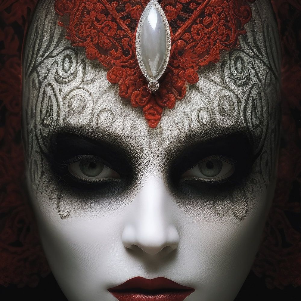Masquerade - Specific to a mask is that it allows no facial expressions. It shows one frozen expression, one face behind which the real face is hidden. It instils fear or arouses hilarity, but itself remains closed. It is unwilling to allow another person's gaze access to what lies behind the mask. It does not allow two-way traffic in the encounter. While the face we show each other makes fully recognisable who we are and what our intentions are. It also says things that words or gestures cannot express. It shows our joy and happiness, but also our suffering and sorrow, our fear and helplessness. The face speaks its own inalienable language. It makes us the human beings we are. Masquerade is an album of intriguing portraits that explores the complexity of human identity. It raises questions about the duality of human existence, the role of masks in hiding or revealing who we really are, and the tension between the public and the private self. The painting invites the viewer to reflect on the many layers of human expression and the eternal game of identity and disguise in our society.