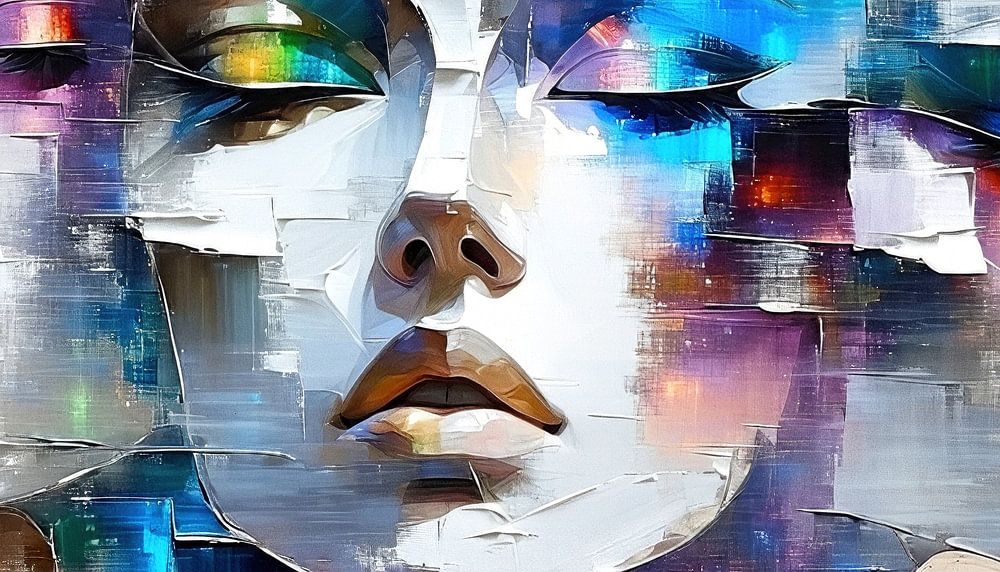 In this artistically designed work in the style of a painting, a fascinating composition of three female faces unfolds, which shine in different, intense shades of colour.