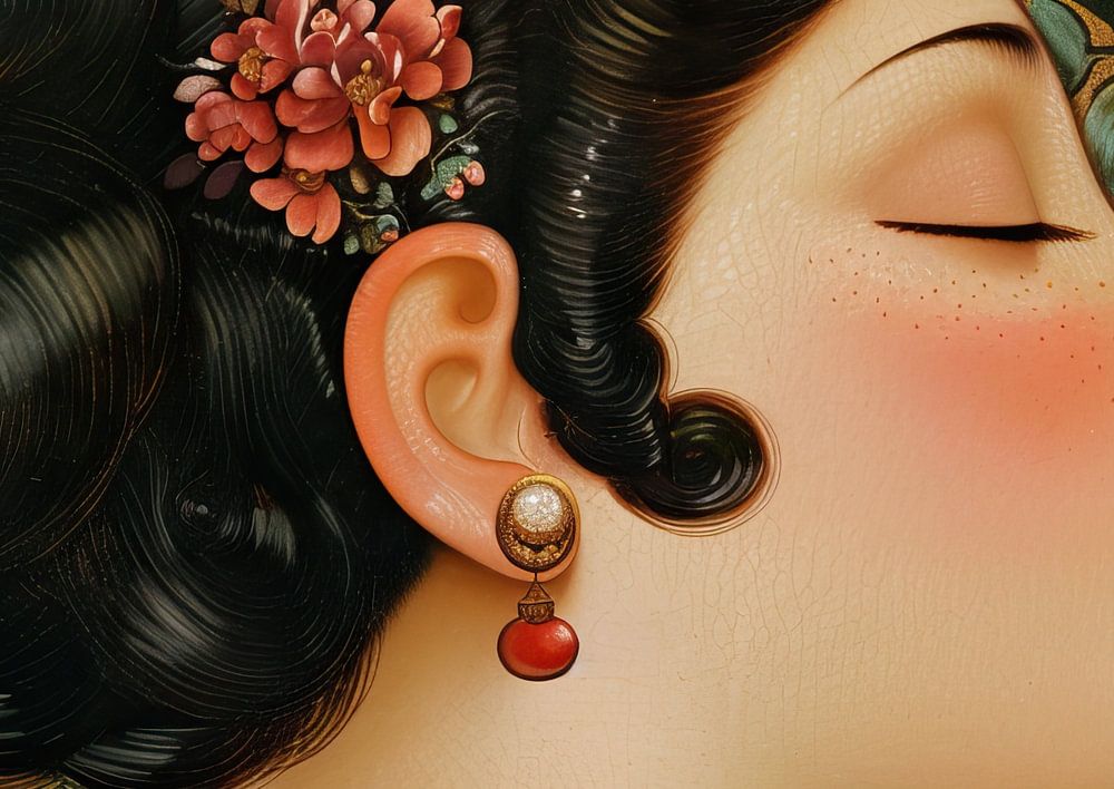 Details: woman, flowers, gold, beauty, serenity, art, portrait, harmony, embellishments, femininity