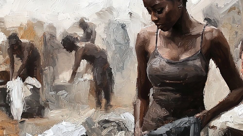 In a haunting, realistic painting, women wash hard-working clothes in buckets outdoors. The muted colours and detailed depiction show the poverty, the daily struggle for survival and the cohesion of the women. The painting highlights social inequalities and the strength of community and sisterhood.