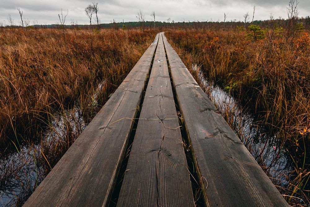 Ominous gray clouds over a hiking trail right through a swamp landscape in Sweden. Because of the changing water levels, a path has been constructed with scaffolding planks. On either side are reeds, grasses and other types of vegetation.