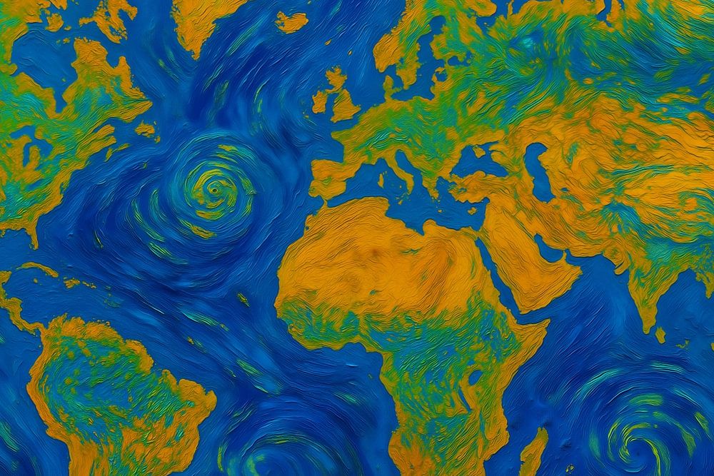 This world map is rendered in the expressive style of Vincent van Gogh. Swirling brushstrokes in deep blue, green, and gold bring the continents to life against a dynamic sky full of stars and motion. The result is an artistic interpretation of our world, captured in the vibrant colors and energy that make Van Gogh so distinctive.