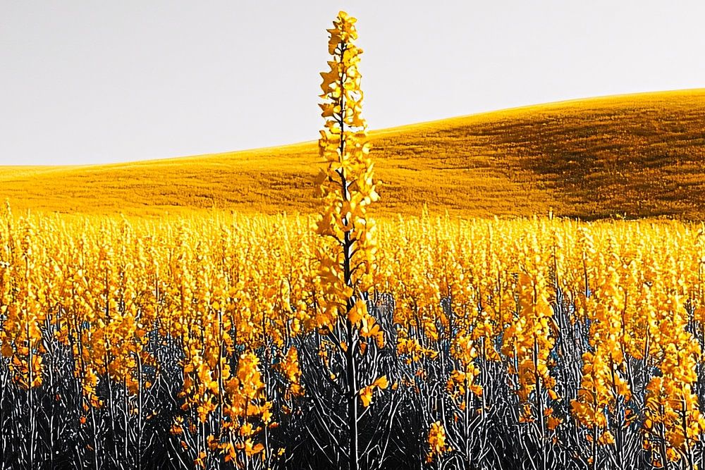 This unique artwork depicts a breathtaking field of flowers with a central focus on vibrant shades of yellow, interspersed with contrasting dark tones. The minimalist approach and subtle transition to a rolling landscape make this design ideal for modern and rustic interiors. Perfect for adding a touch of nature and elegance to any space, while evoking a serene and harmonious atmosphere.