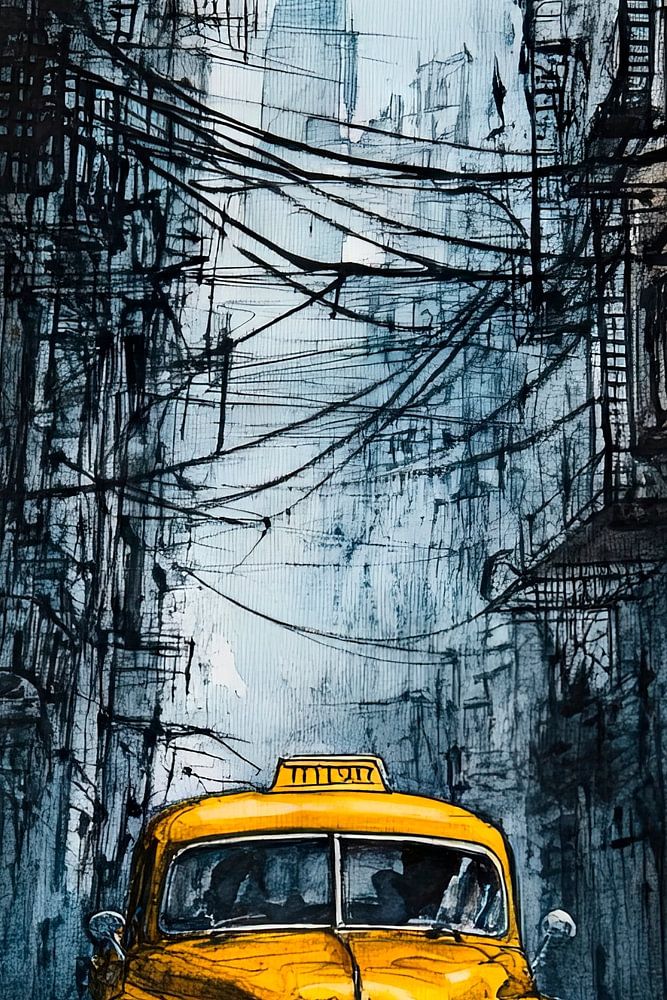 In the heart of a gloomy alleyway, where shadows and neon lights meet, a bright yellow taxi flashes out. Surrounded by tangled cables and high, grey walls, it shines like a glimmer of hope in urban loneliness. The backdrop tells stories of haste and standstill, while the city looms mysteriously in the background.