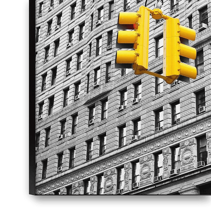 Yellow traffic lights contrasting against a black and white textured building to make a strong piece of visual art that really pops!