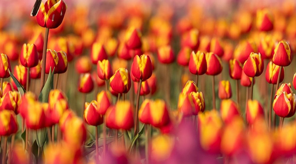 This yellow wagtail sat atop a tall protruding tulip. This made the whole wagtail clearly visible and stood out nicely against the other colour tulips in the background.