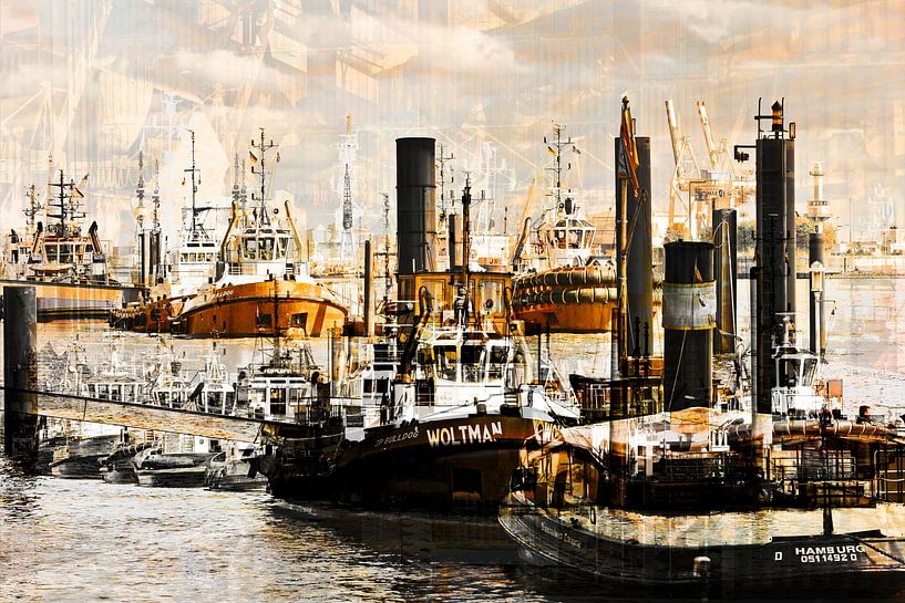 Hamburg's fascination is due in no small part to the Port of Hamburg. Tugboats and some of the ships in the museum harbour are among those in focus. This image processing combines the current support of shipping traffic, especially the "big pots" today. In contrast, the historical tugboats are in the foreground. They give an impression of harbour traffic in times gone by.