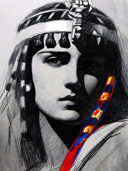 This detailed portrait captures the enigmatic beauty and regal presence of the legendary Egyptian queen in her youth. Executed primarily in black and white with fine pencil and charcoal strokes, the artwork emphasises strong contrasts of light and shadow, highlighting Cleopatra's intense gaze and dignified expression. The artfully drawn…