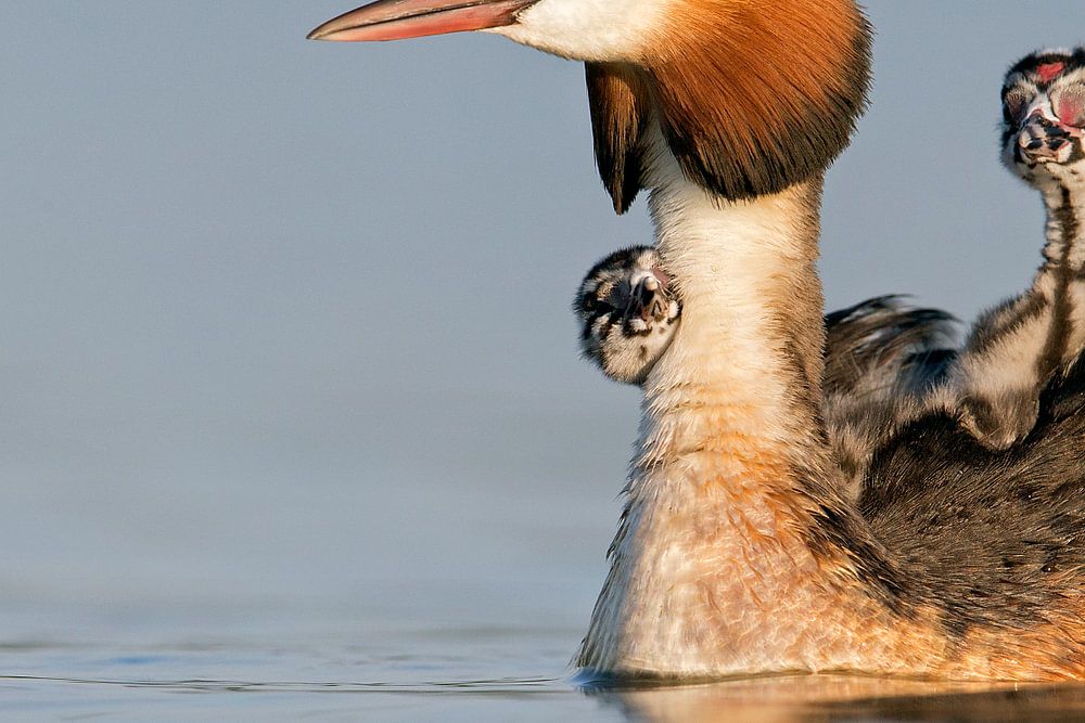 Grebe with boy in the back. Part of a multi-year project in which the grebe is portrayed. In collaboration with Brabants Landschap. In the beginning, the young are often carried on the back by their parents because otherwise they would cool off quickly in the water.