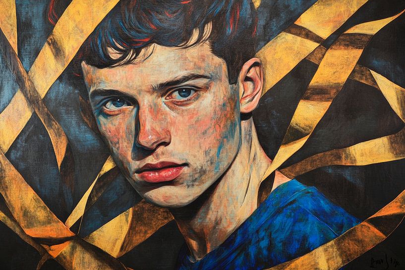 Buy this portrait Young man in front of an abstract background by Poster Art Shop on canvas, ArtFrame, poster and wallpaper, printed on demand in high quality.