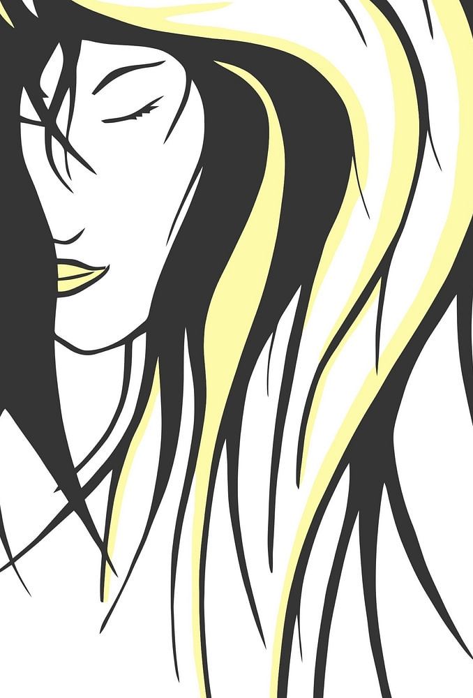 Her beautiful full lips are also accentuated by the yellow brush pen. Her lips and her nose are slightly covered by the hair falling over her face.