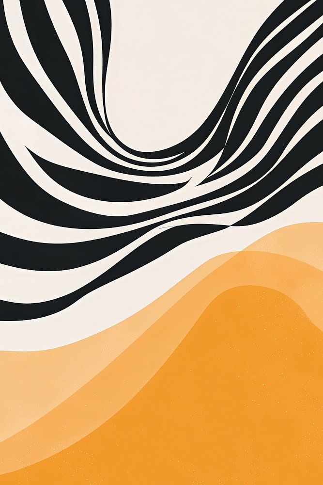 A minimalist artwork in which black and white undulating lines, reminiscent of zebra stripes, elegantly merge with warm orange tones reminiscent of desert dunes. The composition creates a hypnotic movement where organic shapes and clean patterns meet in perfect geometric balance.