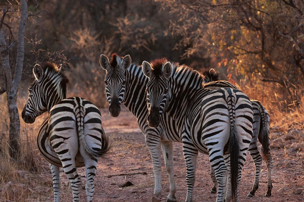 And sun with its last rays beautifully shines on the manes. Each zebra has its unique stripe pattern.