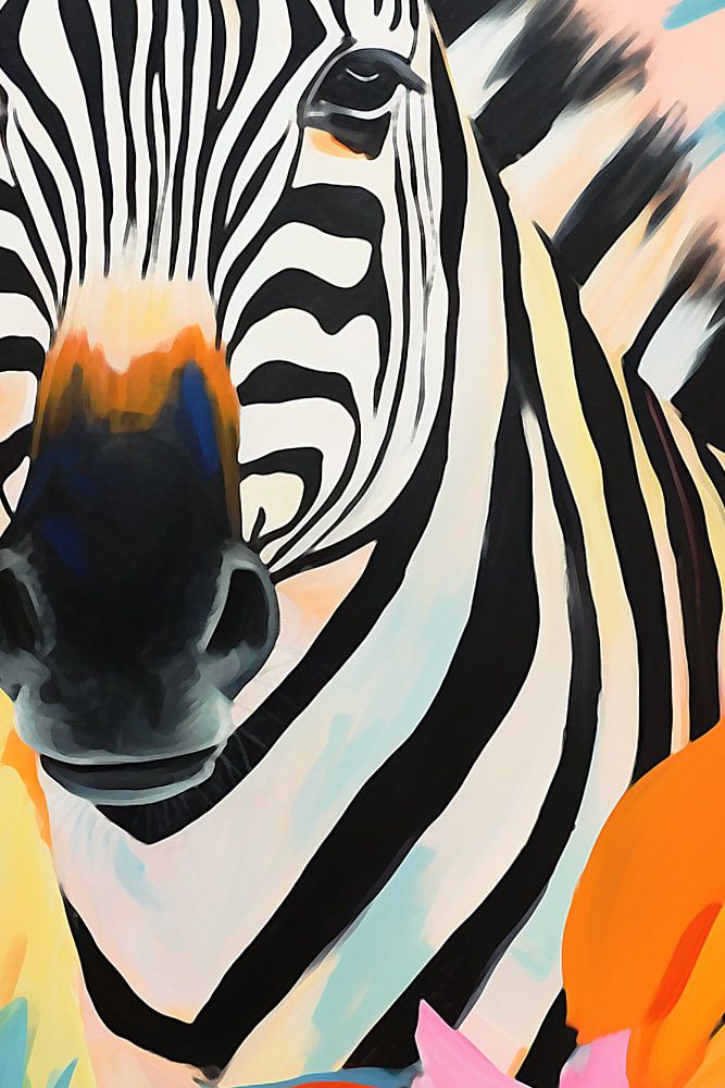 The beautiful black and white striped Zebra in soft friendly tones. Large flowers against a blue background. The most striking of all with the distinctive pattern all over the body. Impressively beautiful.