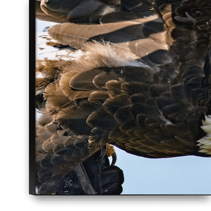 Zeearend ook bekend als adelaar staat op het punt weg te vliegen met op de achtergrond een strakke lichtblauwe lucht.