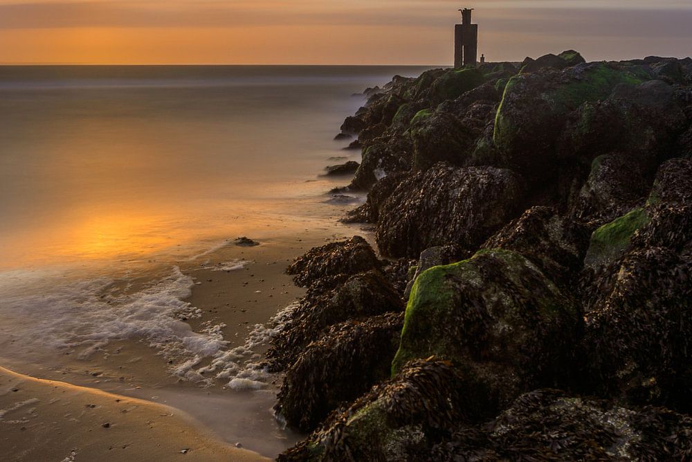 Dutch coast with rocks on which a beautiful soft green moss sits and the sea like milky water a truly magical evening sunset.
