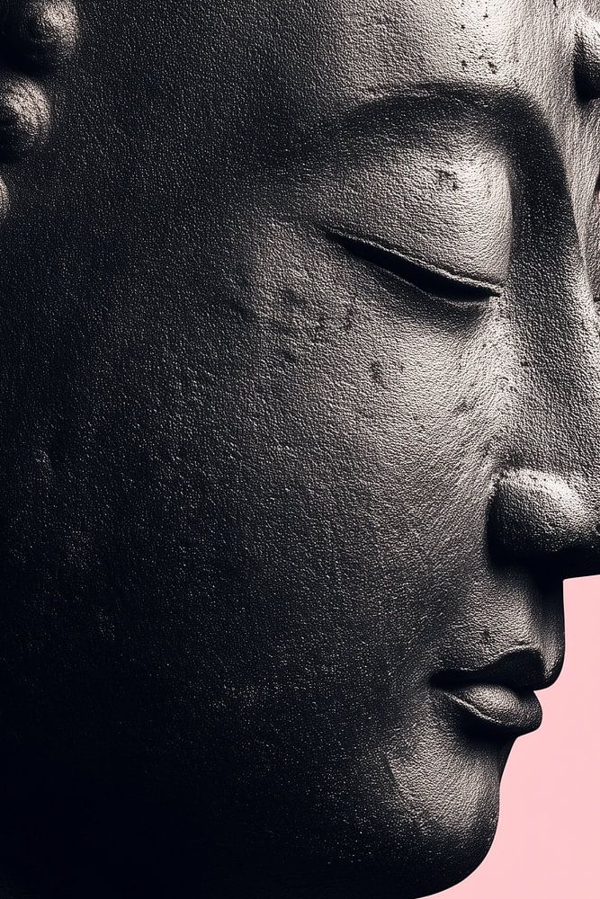 A serene, traditional Buddha statue stands out powerfully against a modern, plain pink background.