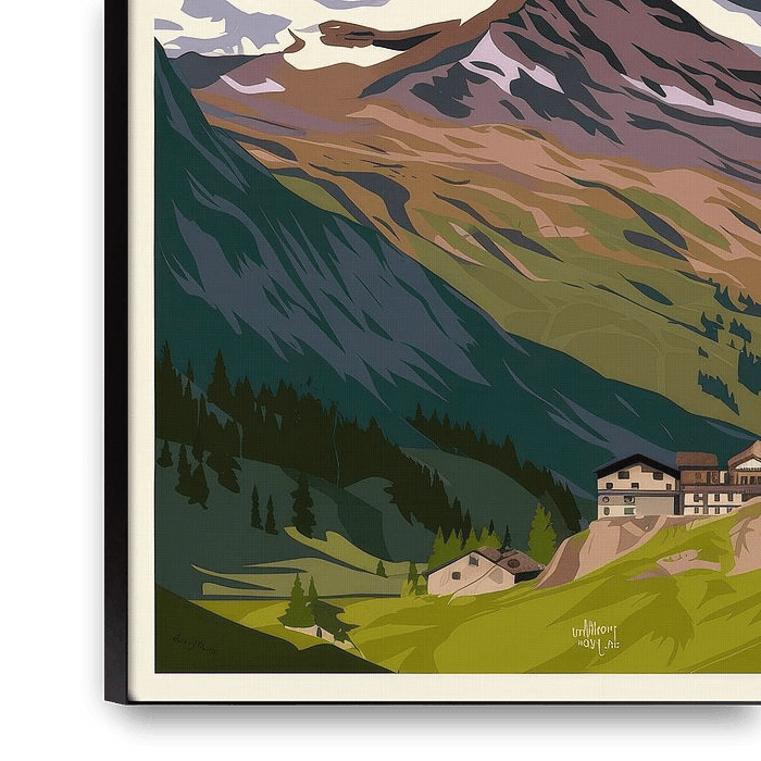 The Matterhorn rises majestically, surrounded by lush greenery and picturesque buildings that blend harmoniously into the alpine landscape. The clear lines and vibrant colours invite you to feel the fresh mountain air. This work of art is perfect for the living room to make alpine dreams come true.