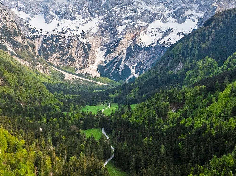 Zgornje Jezersko valley in Slovenia aerial view during a beautiful springtime day with the mountain range around the Grintovec mountain peak in the Kamnik–Savinja Alps.