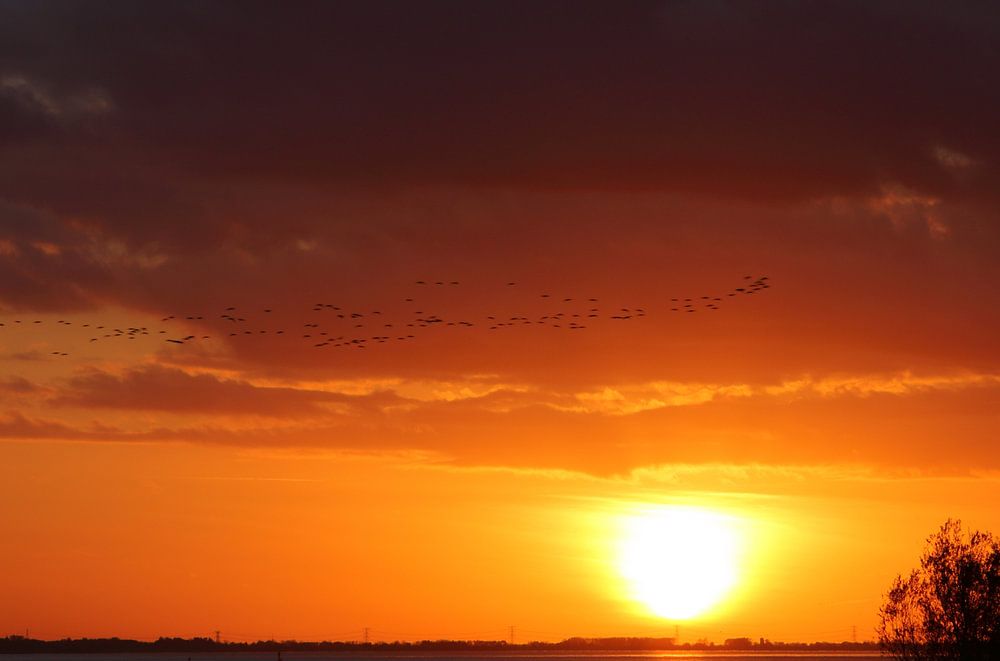Een zonsondergang op het Eems estuarium laat de Hollandse kust als een silhouet verschijnen tijdens een zwerm wilde ganzen vliegen over het scherm.
