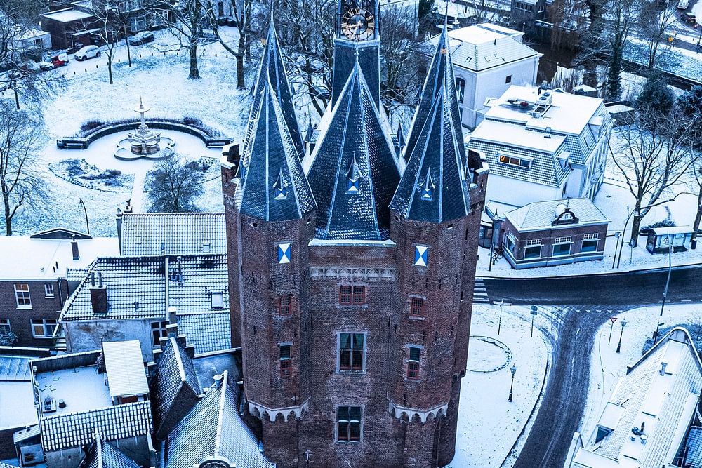 Zwolle Sassenpoort old gate during a cold winter morning with snow on the rooftops in the downtown district seen from above. The Sassenpoort was constructed in the 14th century, specifically between 1406 and 1409, and served as one of the main entrances to the fortified city of Zwolle. It was built as part of the city's defensive walls and was primarily used to control access into the city, as well as to protect its inhabitants from potential threats.The gate's name, "Sassenpoort," translates to "Saxon Gate" in English, which refers to the merchants from the Saxon region who would pass through this entrance into the city. The Sassenpoort was strategically positioned at a crucial location along the city's defensive walls, connecting the city center with the region to the east.Architecturally, the Sassenpoort is an impressive example of Gothic brickwork. It features a rectangular shape with a height of approximately 38 meters (124 feet) and a width of around 20 meters (66 feet). The gate is adorned with decorative elements, including spires, battlements, and turrets, which give it a distinctive and imposing appearance.
