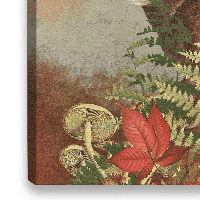Together, they form the atmospheric portrait of a hare, half-hidden behind autumn leaves, ferns and mushrooms.
