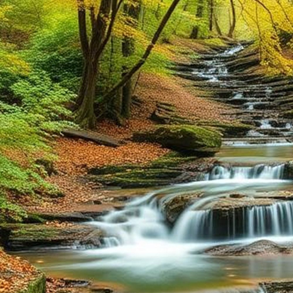 a fairytale waterfall flowing over stones in a green lake in the green orange forest leaves with light-filled natural landscape.