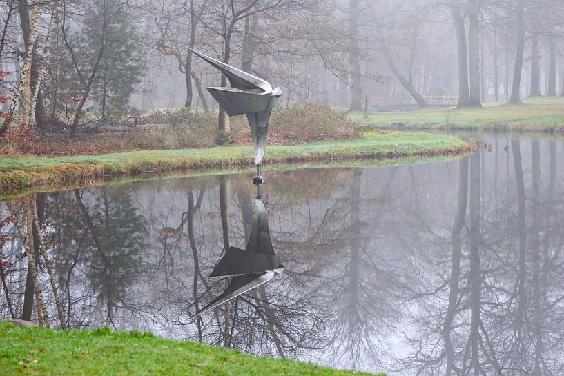 an artistic statue positioned in the narrow waters surrounding the castle groeneveld