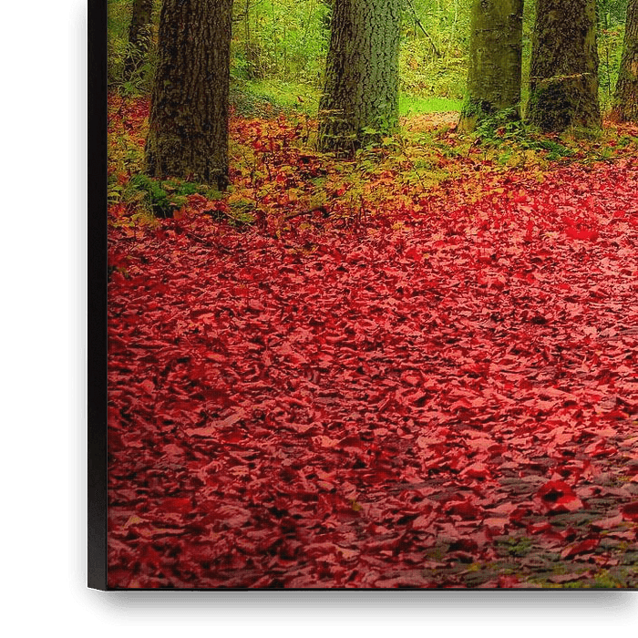 A beautiful dark autumn forest with many colors, including red and a green color. Two people are talking in the back of the forest. photo in minimal art. on request also available in format 16: 9