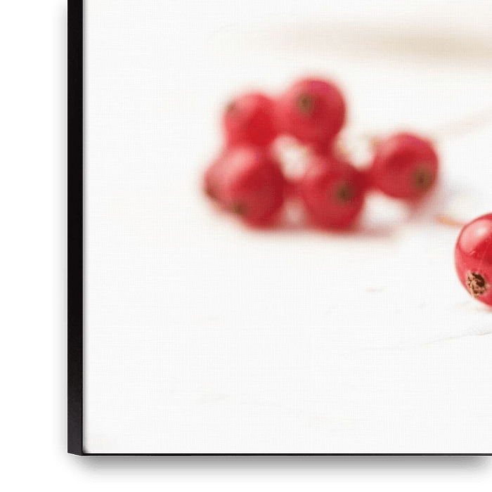 Buy the photo beautiful red currant berries from the garden in a glass bowl and on the table, background with copy by Maren Winter on canvas, ArtFrame, poster and wallpaper, printed on demand in high quality.