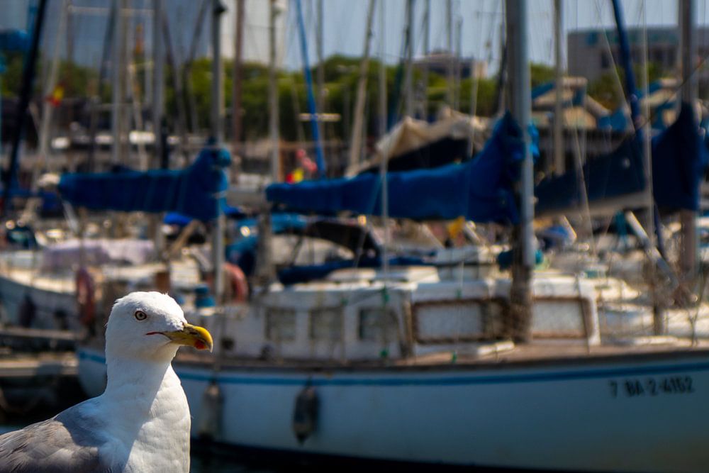 a bird resting in a sailboat harbour