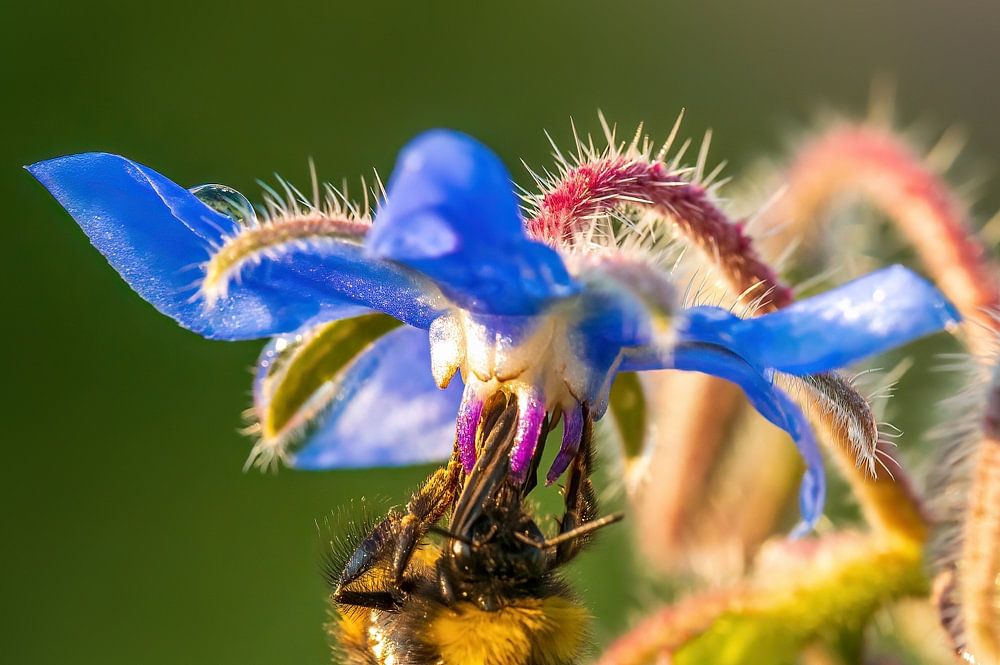 About "blue borage flower blossom with bee"