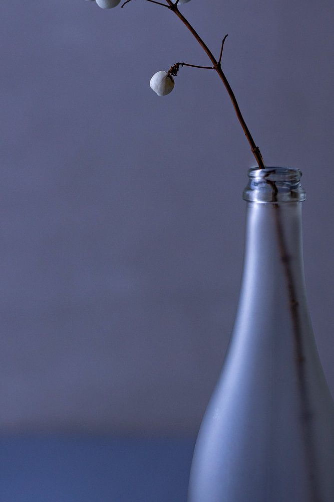 The beautiful image of a bottle containing a branch with snowberries. Photo taken when it had snowed. Reflection of the light from the snow through a glass curtain on the bottle with branch.